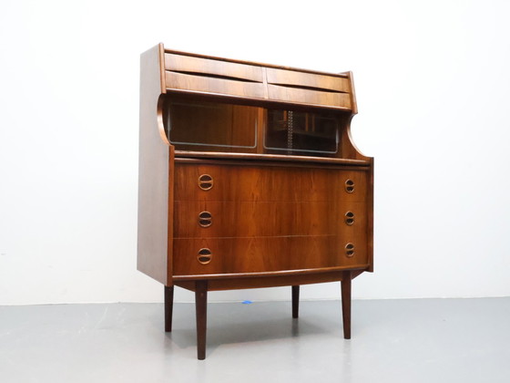 This Danish design secretaire, designed by Gunnar Falsig for Holstebro, is a beautiful example of Mid - Century Modern style. Made of high-quality rosewood with glass details, it offers both functionality and aesthetics. The secretary has multiple drawers and a pull-out work surface, ideal for home work or as a stylish storage solution.