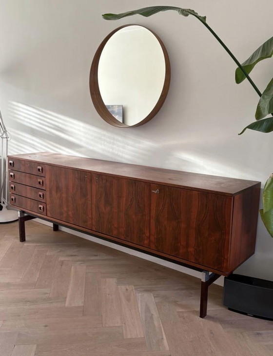 A beautiful Danish design sideboard that instantly gives your living room a stylish look. Made of solid rosewood, this piece of furniture exudes a warm, natural charm that fits perfectly into a modern interior.