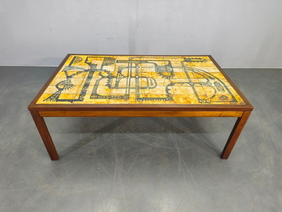 Exceptional Danish Mid Century coffee table produced by Haslev Møbelfabrik in the 1960s, featuring a striking composition of hand painted ceramic tiles signed by Otto Detlefsen.