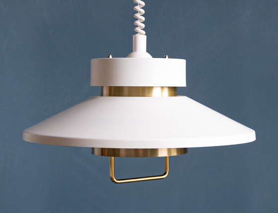 This sleek Danish design lamp is perfect for lovers of Scandinavian interiors. The fixture is powder coated white on the outside, while the inside shines with gold metalwork. Thanks to the famous bowl system, the light is beautifully diffused downwards, creating an atmospheric ambiance.