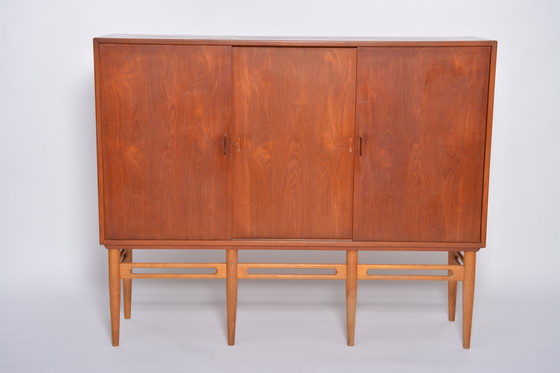 This cabinet was designed and produced in the 1950s in Denmark. The cabinet features three sliding doors hiding shelves and drawers. The cabinet is made of veneered teak while the frame is made of oak. It has some small dents (see photos) but overall is in very good condition.