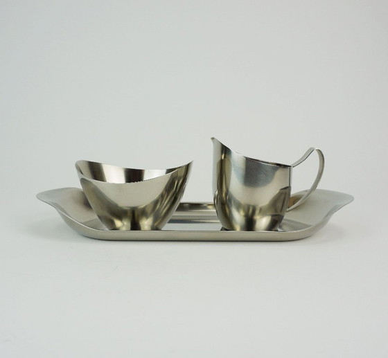 3-piece set, consisting of sugar bowl, creamer and tray. Marked stainless steel made in Denmark and logo. 1960s to 70s.