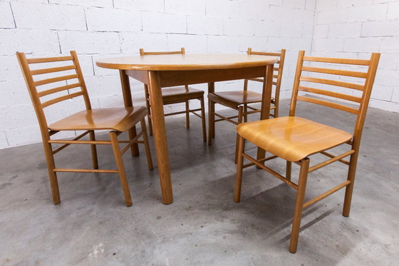 Modernist Danish-made dining set comprising a round convertible table and four matching chairs from the 1980s.