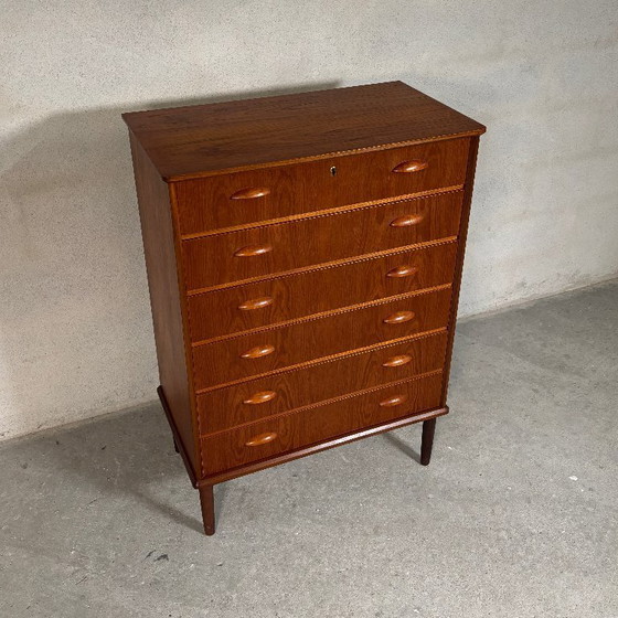 Well-proportioned Danish chest of drawers from the 1960s, crafted from warm teak and featuring six smooth-running drawers with beautifully shaped handles. The wood displays a beautiful, continuous grain pattern that emphasizes the quality of the craftsmanship.