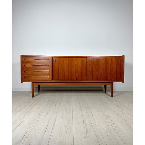 Beautiful Danish teak sideboard by Johannes Andersen for Uldum Møbelfabrik. Made of high-quality teak wood. Generous storage space and minimalistic design consisting of 2 sliding doors and 4 drawers. Neat original condition with age-related signs of use.