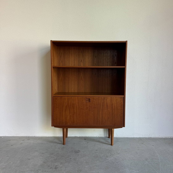 Vintage bookcase from the 1960s. Originating from Denmark and made out of teak. The bookcase has a swinging door with a couple of drawers behind it.