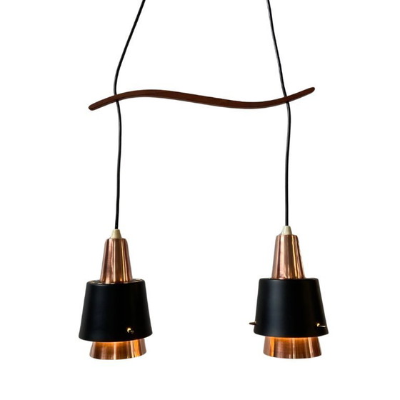 This Danish double pendant lamp is a refined design that perfectly balances metal and wood. The design is likely attributed to Bent Karlby. Two black metal chalices with copper-colored brass details are connected by an elegantly curved teak element, giving the lamp a warm yet graphic look.