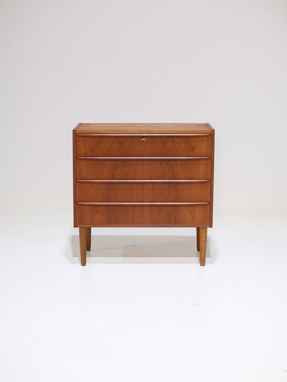 Danish chest of drawers, 1960s. This chest of drawers is made of teak and has four drawers with beautiful long handles.