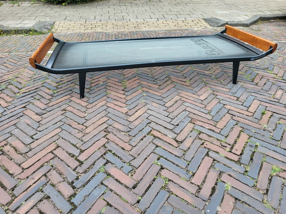 This Auping daybed features a sleek metal frame with wooden accents, embodying a Mid Century Modern style. Its minimalist design makes it a versatile piece for any room. The sturdy construction ensures durability, while the elegant combination of black metal and brown wood adds a touch of sophistication. Ideal for lounging or as an extra sleeping space.