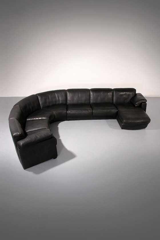 This exceptional modular sofa by De Sede embodies the timeless elegance and craftsmanship for which the Swiss brand is renowned. Designed in the spirit of true mid-century aesthetics, the piece combines sculptural lines with luxurious comfort. Crafted from high-quality black leather, each module reflects the precision and durability that has made De Sede a benchmark in premium furniture. The sofa consists of seven individual sections, allowing endless layout possibilities to suit any interior, from a spacious living room to a stylish lounge or office environment. Two of the modules include armrests, creating a refined and beautifully finished silhouette on both ends. Its presence enriches any room with sophistication and understated luxury, making it both a collector’s item and a functional showpiece.