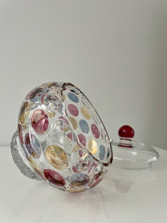 This glass jar on foot with cheerful and colorful polka dot pattern is a real eye-catcher. The jar is made of clear glass with ornate round decorations in pink, gold and purple, and has an elegant lid with pink glass knob.