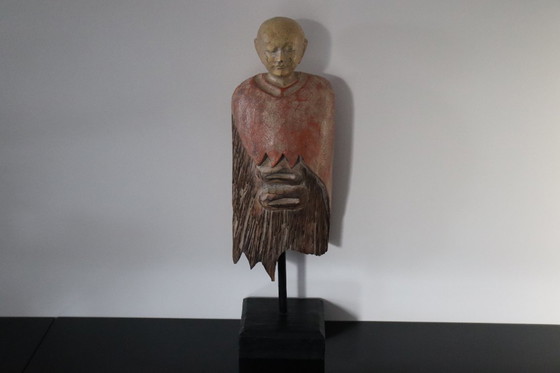 Discover the serene beauty of this hand-carved wooden statue of a monk. This artwork exudes peace and simplicity, perfect for a meditative space or as a unique decorative piece in your home.