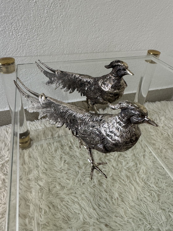Pair of decorative pheasants (tableware) in silver-plated metal from the 70s; very good condition Length: 29cm Width: 5cm Height: 13cm Fast and careful delivery