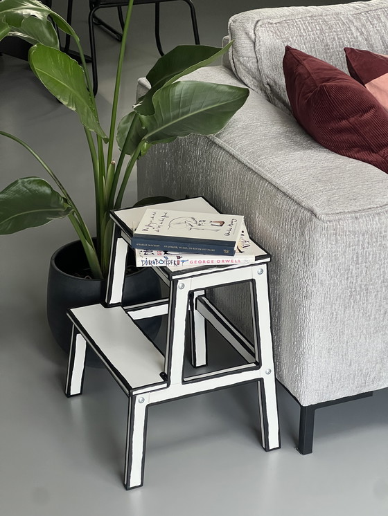 Decorative stool. White stool with hand painted black accents. Could be used as a stool, side table or decorative piece in your home.