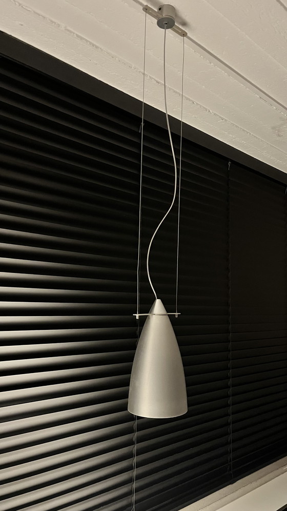 Delta Light Gothic, set of four stylish, modern pendant lights made of brushed aluminum. These lights provide beautiful focused light, ideal for above a dining table, kitchen island, or bar. They are in like-new condition and work perfectly. Dimmable.