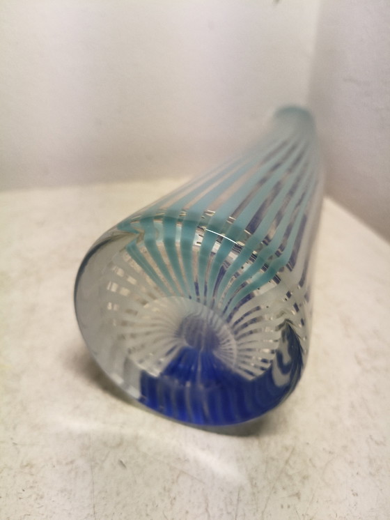 Discover the timeless elegance of this beautiful vase designed by the famous Dino Martens. This vase, with its sophisticated blue and transparent colors, is a masterpiece of glassblowing art that adds a touch of sophistication to any space.