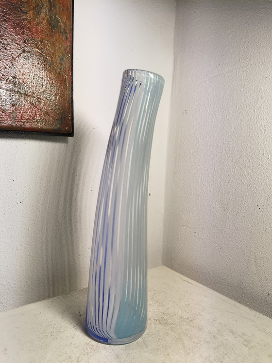 Discover the timeless elegance of this glass vase designed by the famous Dino Martens. With its sophisticated blue and white stripes, this vase exudes a visual spectacle that feels both modern and classic.