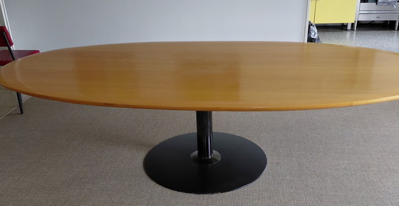 Imagine hosting your next dinner party around this sleek, modern dining table. With its smooth wooden top and sturdy metal base, it's the perfect focal point for both casual meals and formal gatherings.