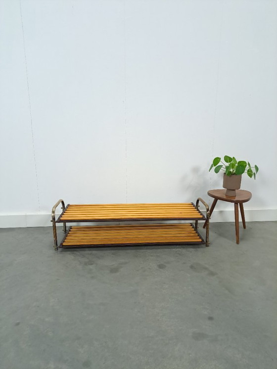 Vintage shoe rack. The shoe rack comes from Sweden and is ideal for neatly putting away shoes. The rack has a metal frame, a brown plastic insert and wooden holders. The brown plastic tops can be easily removed for cleaning.