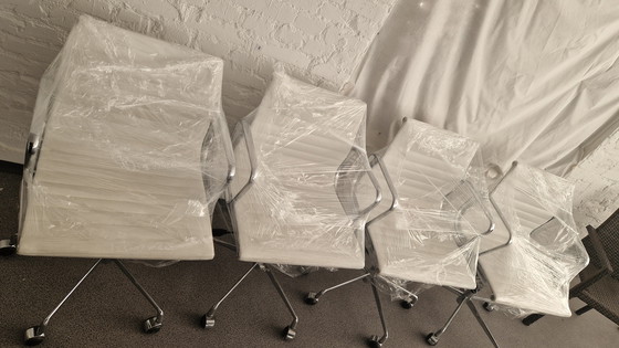 These elegant conference chairs from Stilwerk combine modern design with ergonomic comfort. The white leather upholstery exudes timeless elegance, while the chrome-plated metal frames ensure stability and durability. The chairs are mounted on casters and offer adjustable seat height to suit individual needs. Perfect for any stylish office or conference room, these chairs offer not only comfort but also an appealing aesthetic. The four chairs are barely used and in excellent condition; they come pre-packaged with protective film.