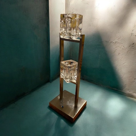 Modern designer lamp with two solid glass elements in the so-called Ice Cube style, set in a sleek metal frame with a square base.