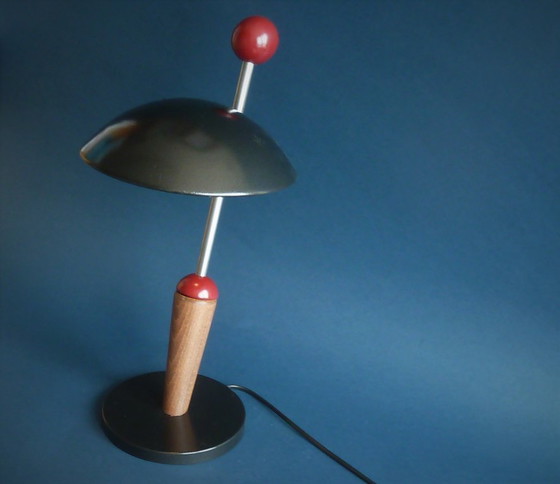 Designer desk or table lamp by LUXDALES "FERCULUM". The lamp looks fantastic when lit, making it a perfect fit for a desk, dresser, or bedside table. The original patina of the lamp creates a harmonious look. The dimensions are: shade 22 cm, base 17 cm, total height 45 cm. It is in very good condition.
