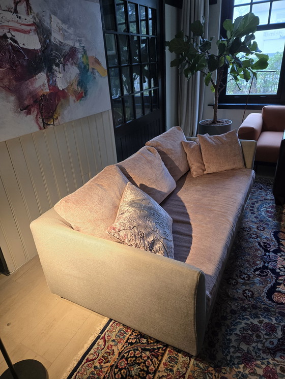 This beautiful Designers Guild sofa is a real eye-catcher in your living room. With its soft gray and pink tones, it adds a touch of elegance and comfort to any room. Perfect for sinking into after a long day.