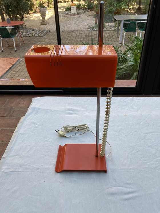 70s desk lamp pop orange, adjustable height, works lighting through the pull wear, light conform to age in very good condition. Not broken