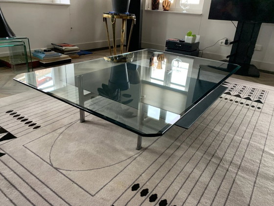 This exquisite coffee table from B&B Italia, designed by Antonio Citterio and Paolo Nava, is a masterpiece of modern design, perfect for adding a touch of elegance to any living space. Its sleek glass top offers a clear view of the intricate design below, while the sturdy metal legs provide stability and style. The leather accents add a luxurious touch, making this table not only functional but also a statement piece.