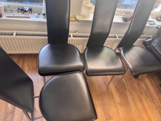 Designed by Giancarlo Vegni for Fasem in the 1980s, this set of four dining chairs exudes timeless elegance. The chairs are upholstered in high-quality black leather and have a sleek metal frame, creating a modern look. Perfect for a stylish interior, these chairs offer both comfort and durability. A wonderful addition to any dining room.