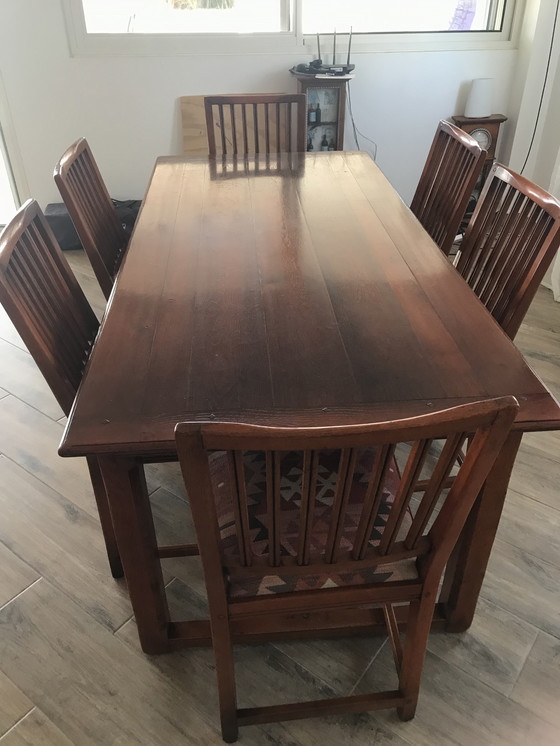 Oak dining table, lacquered, and 6 chairs, upholstered. Dutch made.