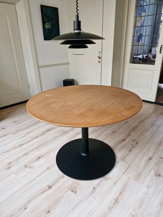 Artifort Circel designer dining table with a laminated oak top and beveled edge. Top diameter: 110cm. Height: 74cm. The base is made of matte black metal.