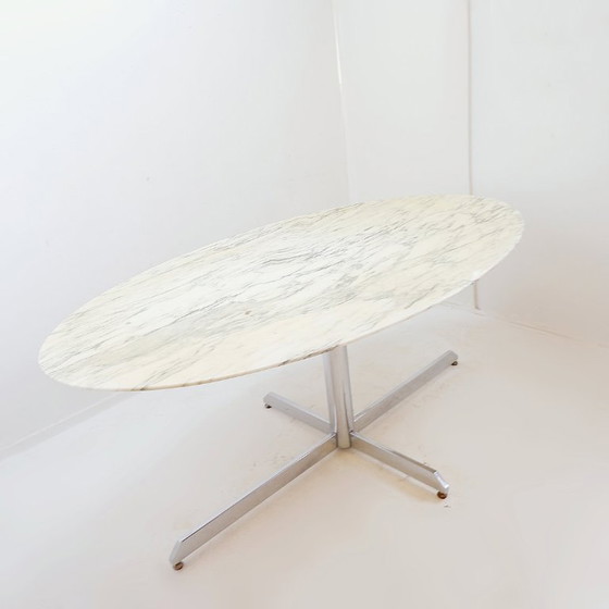 This magnificent table was designed by pioneering American designer and entrepreneur Florence Knoll. She created this piece for the prestigious French design house Roche Bobois in the 1960s. Its oval top is crafted from a particularly striking Arabescato marble, resting on a chrome cruciform base.