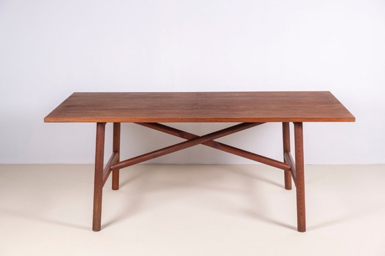 Wonderful mid-century Danish dining table in oak, with cross-section stretchers overlapping underneath the table's surface, made by a Danish cabinetmaker, most likely a unique piece made to order. The perfect dimensions and beautiful details make this table exceptional in quality.