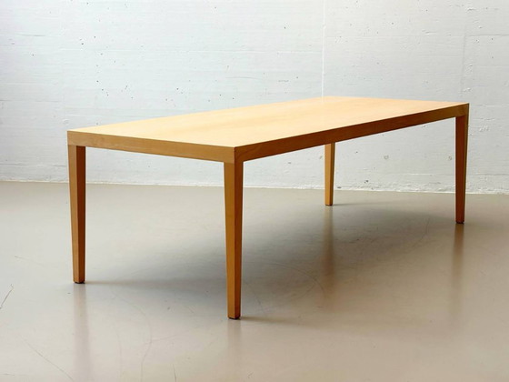A generously sized dining table from the traditional Swiss manufacturer Horgenglarus, known since 1880 for its precise craftsmanship and timeless furniture designs. Made of solid, light-lacquered beechwood with a calm, homogeneous grain and classically understated lines. The construction showcases the solidity typical of Horgenglarus: clean lines, elegantly tapered legs, and high-quality workmanship that makes this table a lasting centerpiece for any dining or work space.