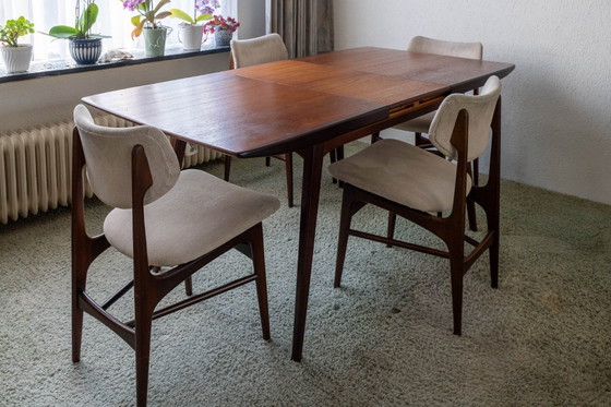 Discover the timeless elegance of this dining set from the renowned brand Webe, designed by Louis van Teeffelen. Consisting of a beautiful dining table and four matching chairs, this set exudes a refined Mid-Century Modern style that will fit perfectly into any interior. The warm wood tones and soft upholstery of the chairs create a harmonious and inviting atmosphere in your dining room. - The table and chairs are crafted from high-quality wood, ensuring durability and a luxurious appearance. - The chairs are upholstered in a comfortable cream-colored fabric that adds a subtle elegance. - Louis van Teeffelen's design is known for its flowing lines and functional aesthetic, making this set a treasured addition to your interior. Add a touch of vintage charm to your home with this unique dining set and enjoy stylish dinners with family and friends.