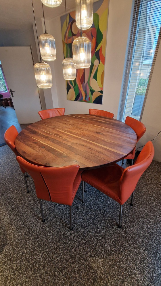 Complete your dining room with this stylish dining table and six leather chairs. The table features a beautiful round oak tabletop that exudes warmth and elegance, perfect for cozy dinners with friends and family. The chairs are upholstered in orange leather, adding a playful and modern touch to your interior.