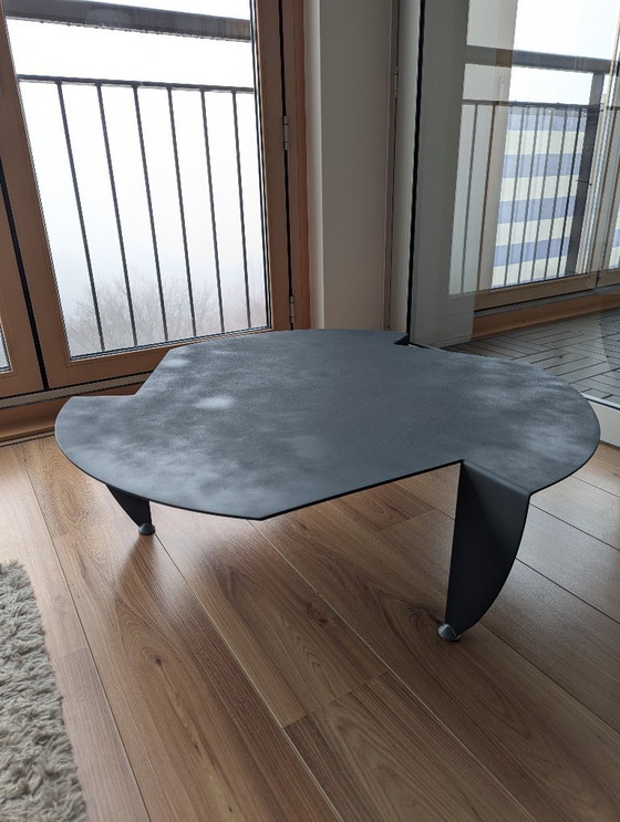 The table is crafted from a single piece of cast aluminum that has been cut, bent, and lightly textured. The three legs extend elegantly from the top, giving it an almost sculptural appearance.