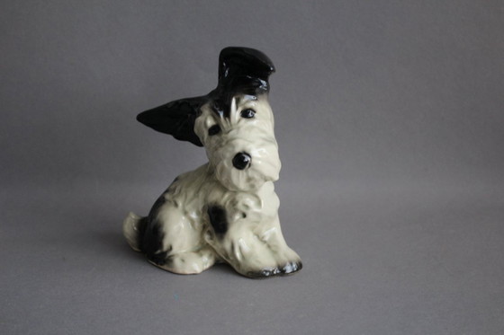 Charming hand-painted terrier figurine from the 1960s. This black and white spotted ceramic figure captivates with its detailed design and nostalgic charm. A perfect collector's item for vintage decor enthusiasts.