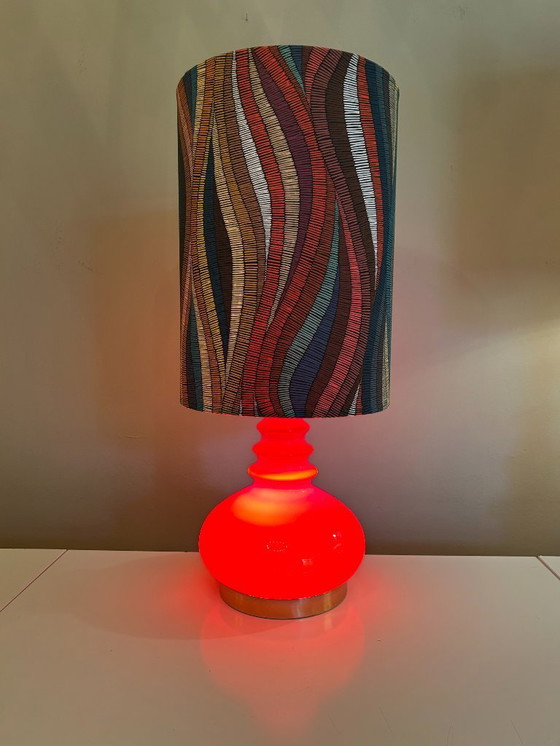This exceptional table lamp from Doria Leuchten thrives on the captivating interplay of form, color, and light. A characteristic feature is the additional internal lighting, which illuminates the bulbous lamp body from within, creating an intense, almost sculptural effect.