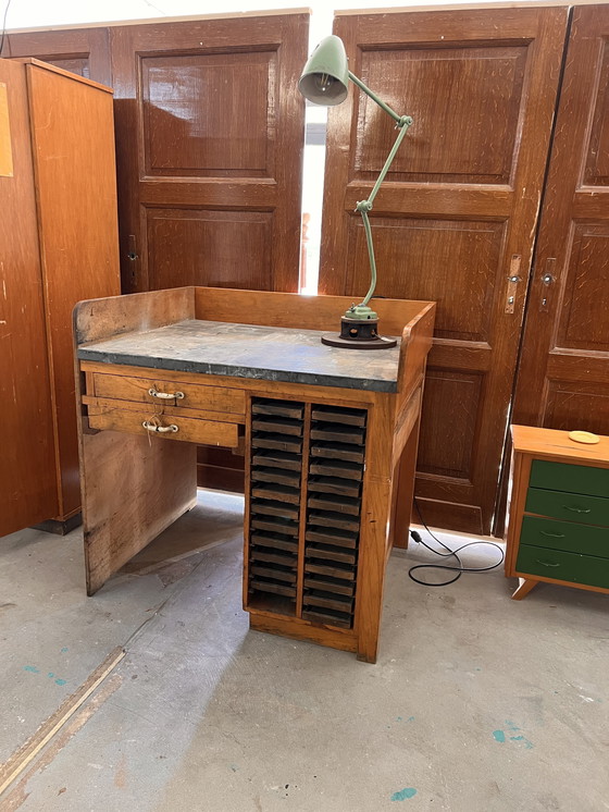 This vintage drukkerij kast, or printing cabinet, exudes a sense of history and craftsmanship that is both functional and aesthetically pleasing. Its robust wooden structure is complemented by a metal top, offering a durable workspace that has stood the test of time.