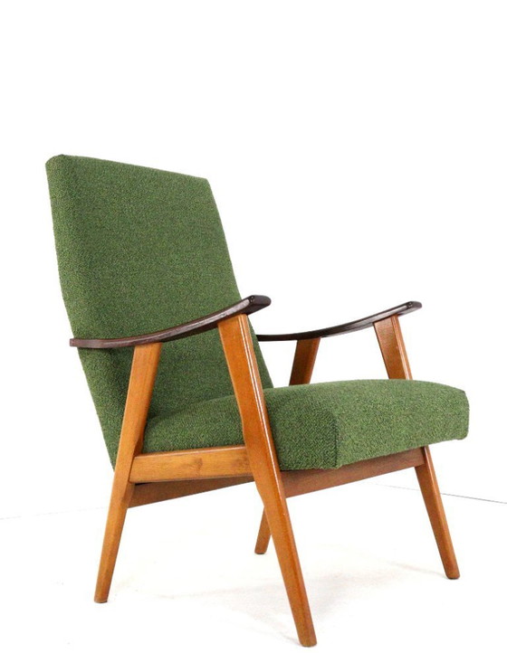 The entire upholstery is brand new and made of a heavy quality furniture fabric in a beautiful green color with Bouclé effect!