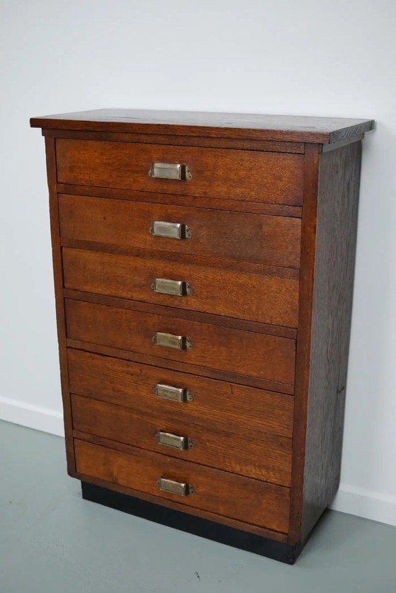 This apothecary cabinet was designed in the Netherlands around 1930 and crafted from oak. It has seven drawers with brass hardware. The internal dimensions of the drawers are: D x W x H 18 x 52 x 8 cm.