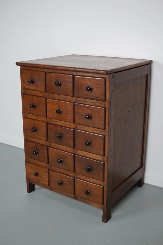This cabinet was designed in the Netherlands around the 1930s and crafted from oak. It was part of a wall unit used in a barbershop, where the drawers were used to store clients' personal brushes and razors.
