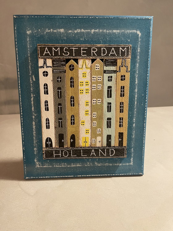 Immerse yourself in the charm of Amsterdam with this exquisite piece of art crafted from recycled wood. This decorative object captures the essence of Dutch architecture, featuring a vibrant depiction of Amsterdam's iconic canal houses.