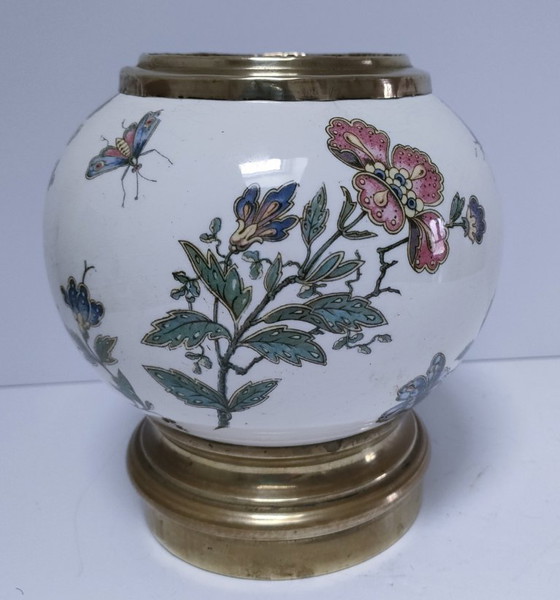 Earthenware spherical vase with brass mounts at the top and bottom. Decorated with flowers and insects. Early 20th century. Good overall condition. Note some minor wear to the upper brass mount and traces of oxidation inside the vase (see photos and zoom). Total height 17.5 cm. Maximum diameter 16 cm. Diameter at the base 11 cm.