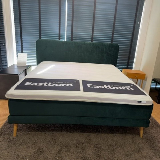 Eastborn Fair box spring - 180x210 Equipped with the Eastborn Thin 9 cm 90 x 210 box springs with a seamless cover, making it look like 1 box spring. Urban oak leg 22.5 cm high, leaving plenty of space under the bed. The Fair headboard has compartments where you can store a nice magazine, glasses, iPad or something similar. Size: 206 wide 8 cm thick - 92.5 High - floating (total height 114.5 cm) Eastborn mattress Q2200 180 x 210 with 5 zones - Q2200 Color mattress Firm + Vivid foam topper 180 x 210 color: Velvet Green - velours