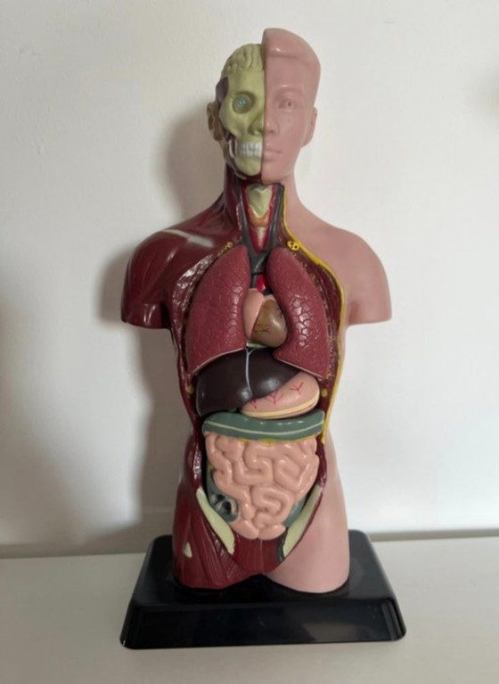 Educational anatomical model depicting a human torso with removable internal organs. This model is designed for the study of human anatomy: it shows the main organs (heart, lungs, liver, stomach, intestines, kidneys, etc.), all removable for detailed observation.