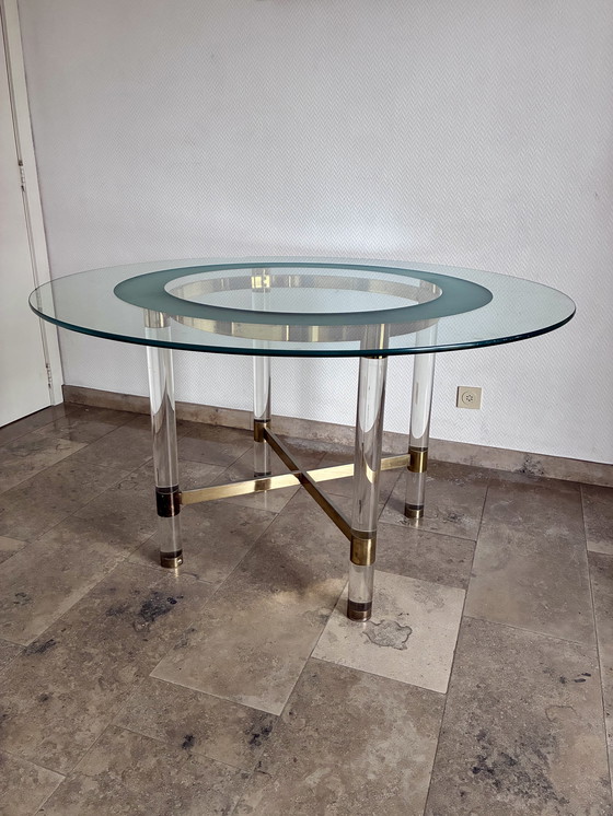 Introducing a beautiful vintage dining table, designed by the renowned Sandro Petti. This exquisite piece effortlessly combines elegance and functionality, making it the perfect focal point for any stylish dining room. The sleek glass top is complemented by unique acrylic legs and brass accents, creating a harmonious blend of modern and classic design elements.