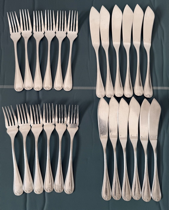 Add a touch of elegance to your table with this 24-piece silver-plated fish cutlery set, Marot Bérain pattern.